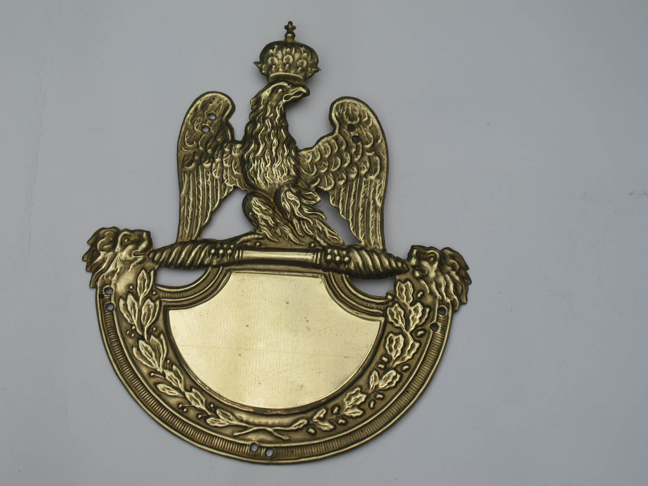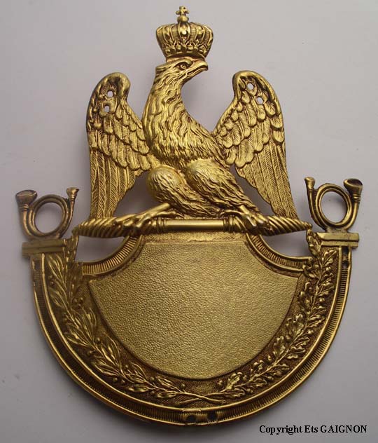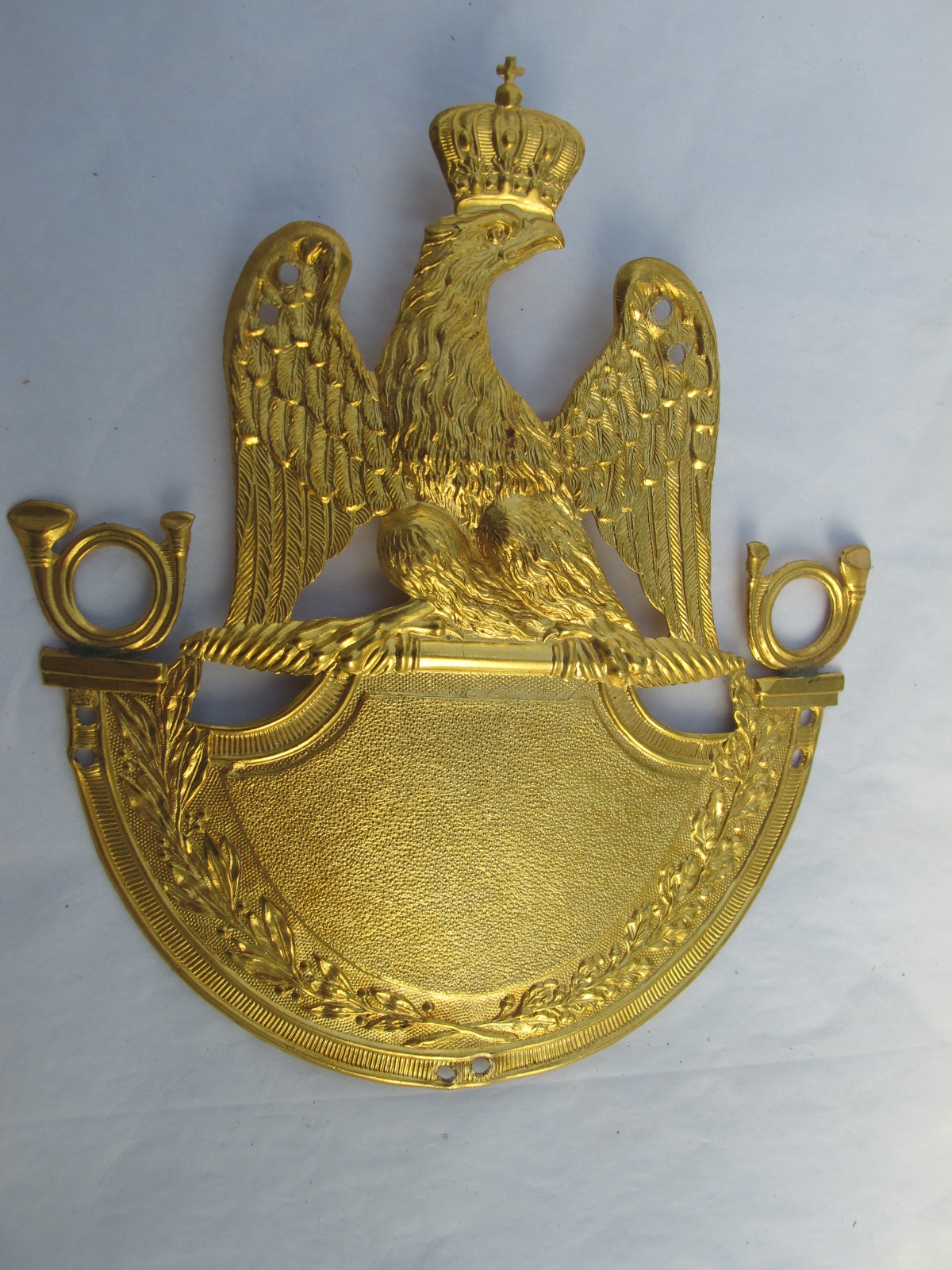 Plaque de Shako de Voltigeur cor de chasse Du règlement 1812 laiton estampé. 115 mm x 135 mm Prix : 110 €